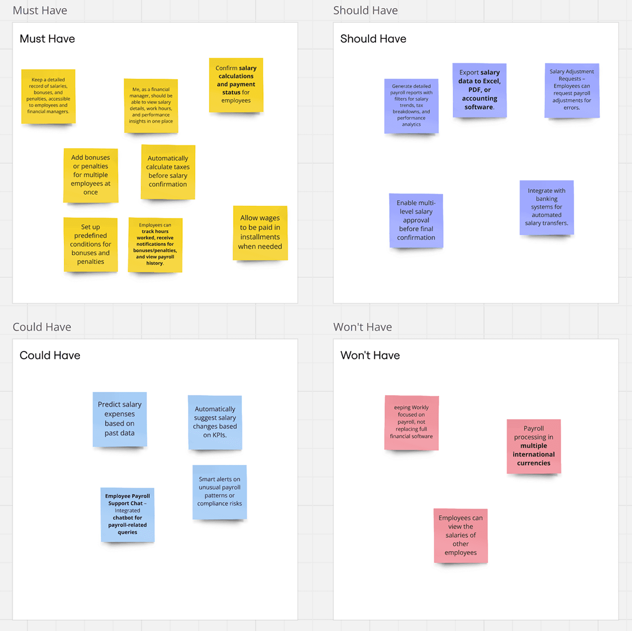 First things first, we'll focus on the rest later on. So, I've suggested to use MoSCoW (Must have, Should have, Could have and Won't have) method to prioritize the functionality.