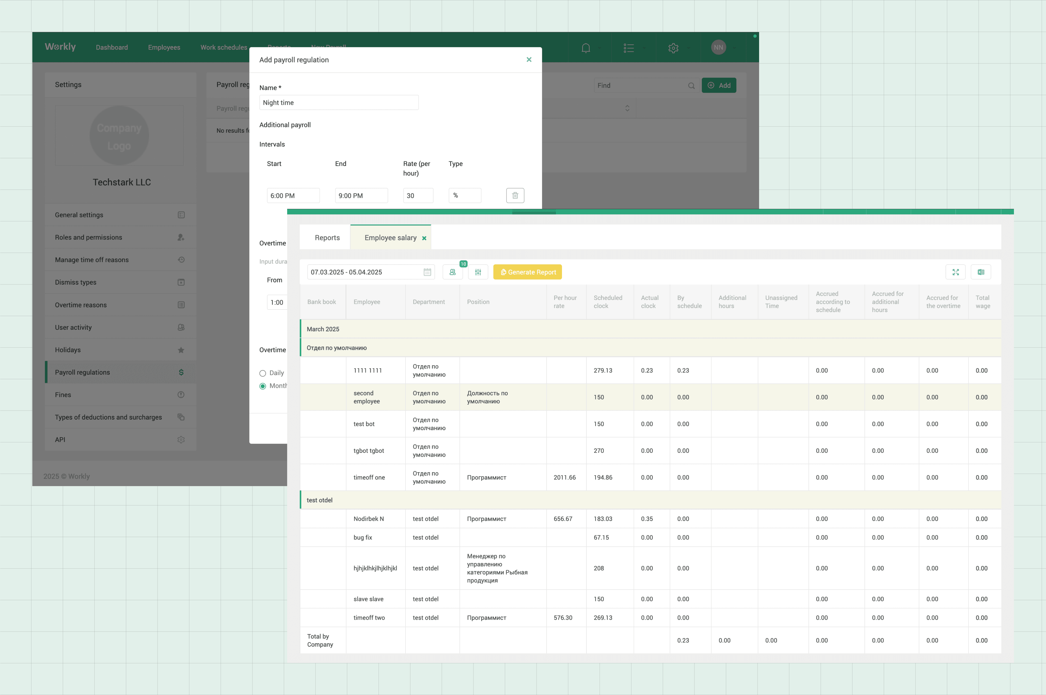 It's possible to set and adjust many rules, such as late arrival penalties, special bonuses and KPIs, hourly rate and overwork etc.